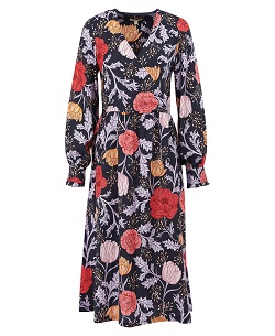 An elegant late afternoon, evening wear dress with a lovely all-over floral print featuring blouson sleeves with ruffles at the cuffs with pockets in the side seams.